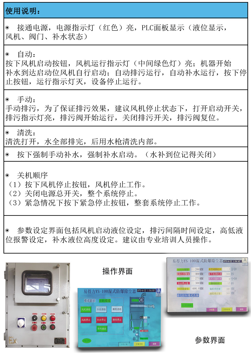 1.工作原理:YS型防爆湿式除尘器采用Q235B钢板制作,中心处理器采用304不锈钢。防爆湿式集尘器是利用与洗涤液(一般