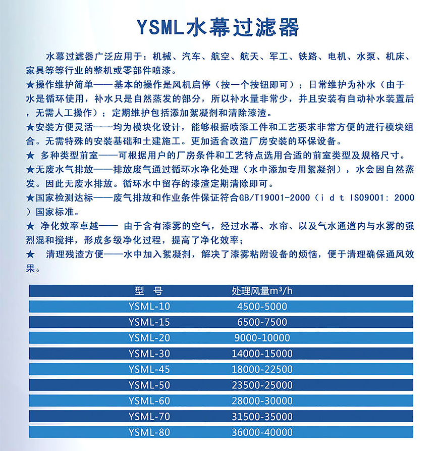 水幕过滤器广泛应用于:机械、汽车、航空、航天、军工、铁路、电机、水泵、机床、家具等等行业的整机或零部件喷漆。 ★操作维护简单——基本的操作是风机启停(按一个按钮即可);日常维护为补水(由于水是循环使用,补水只是自然蒸发的部分,所以补水量非常少,并且安装有自动补水装置后,无需人工操作);定期维护包括添加絮凝剂和清除漆渣。 ★安装方便灵活——均为模块化设计,能够根据喷漆工件和工艺要求非常方便的进行模块组合。无需特殊的安装基础和土建施工。更加适合改造厂房安装的环保设备。 ★ 多种类型前室——可根据用户的厂房条件和工艺特点选用合适的前室类型及规格尺寸。 ★无废水气排放——排放废气通过循环水净化处理(水中添加专用絮凝剂),水会因自然蒸发。因此无废水排放。循环水中留存的漆渣定期清除即可。 ★国家检测达标——废气排放和作业条件保证符合GB/T19001-2000(i d t IS09001: 2000)国家标准。 ★ 净化效率卓越—— 由于含有漆雾的空气,经过水幕、水帘、以及气水通道内与水雾的强烈混和搅拌,形成多级净化过程,提高了净化效率; ★ 清理残渣方便——水中加入絮凝剂,解决了漆雾粘附设备的烦恼,便于清理确保通风效果。