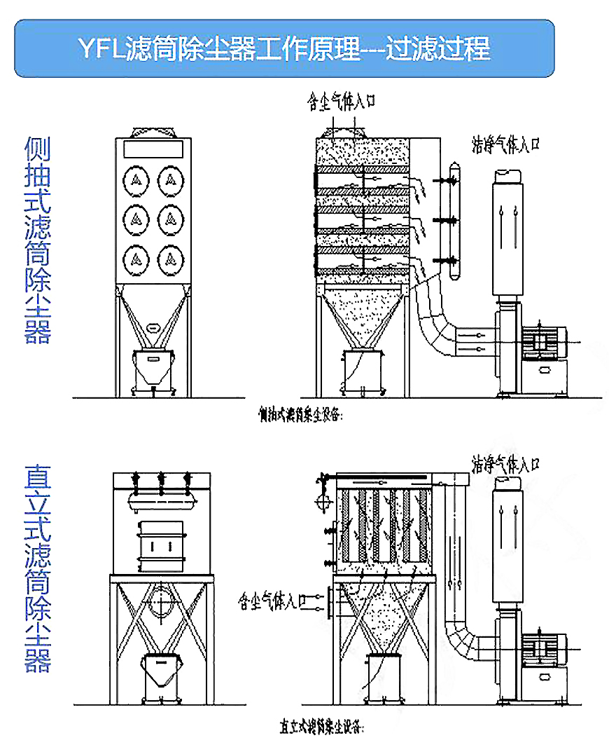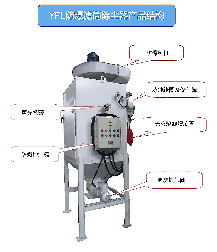 产品介绍: YFL型防爆滤筒除尘器是我司结合环保排放要求研制开发的防 爆型脉冲反吹型工业集尘器,具有风量大、脉冲反