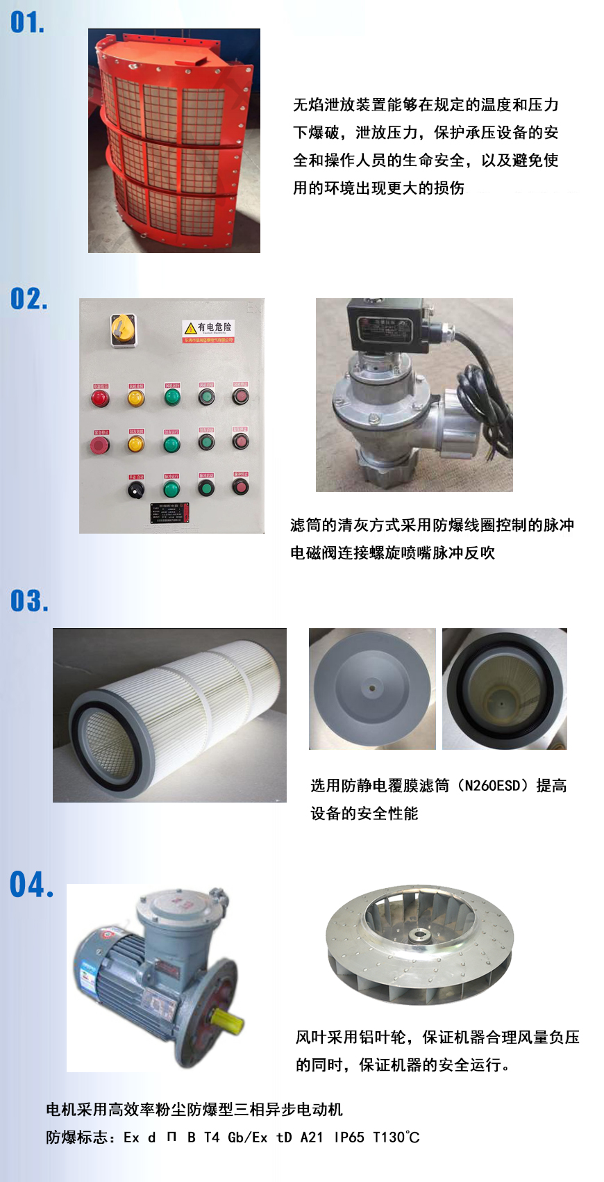 吹、稳定可靠、 占地面积小等特点。专用于易燃易爆粉尘(如面粉、短纤维、食 料、铝合金等)的收集与治理。